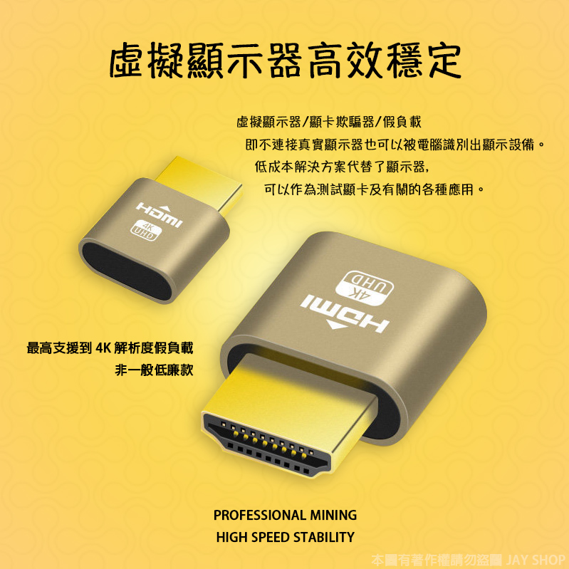 2021 新款 HDMI dummy plug 欺騙器 假負載 最高支援到 4K 挖礦 遠端桌面無螢幕黑畫面 解決遠端桌面沒有接上螢幕的負載 導致黑畫面 或無法連接 ! 本商品非瑕疵不接受退貨 購買前請先做好功課 謝謝 如遇缺貨下單後約 7~14 天到貨寄出 如有提早到貨將提早寄發 恕不接受急件 謝謝 最高支援到 4K 當然也支援 1080P 支援 EDID